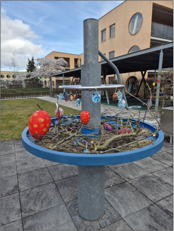Osterbrunnen auf dem Gelände dekoriert 26.03.2026 - Bei eisigen 3 Grad und Hagel, hat die Wohnstätte 2 und die Tagesförderstätte gemeinsam den Brunnen und die Hecke auf dem Agoraplatz dekoriert. Er lädt nun zum Bestaunen mit Augen und Händen ein.